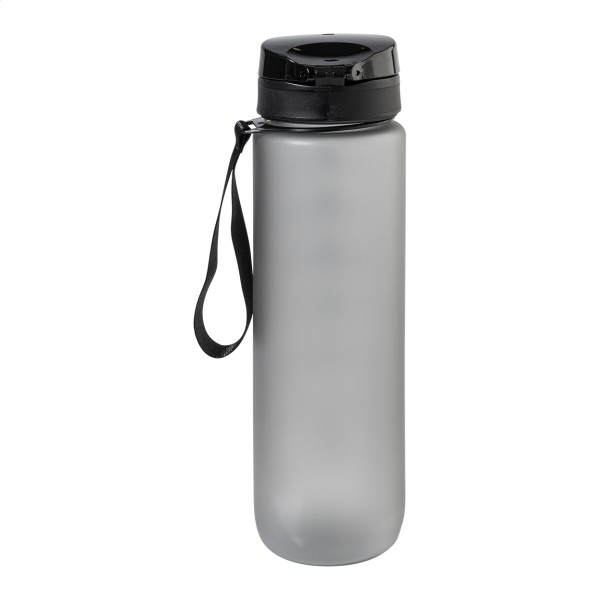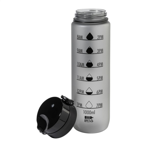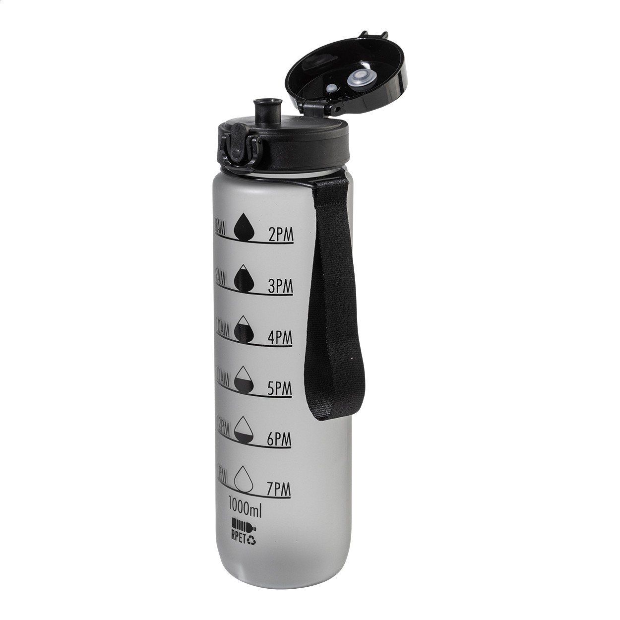 Sticlă sport, din RPET, mată, cu marcaje motivaționale pentru volum și timp, prevăzută cu capac flip-top cu deschidere automată, blocare de siguranță și curea de transport. 1000 ml. Fără BPA. Nu este potrivită pentru băuturi carbogazoase.