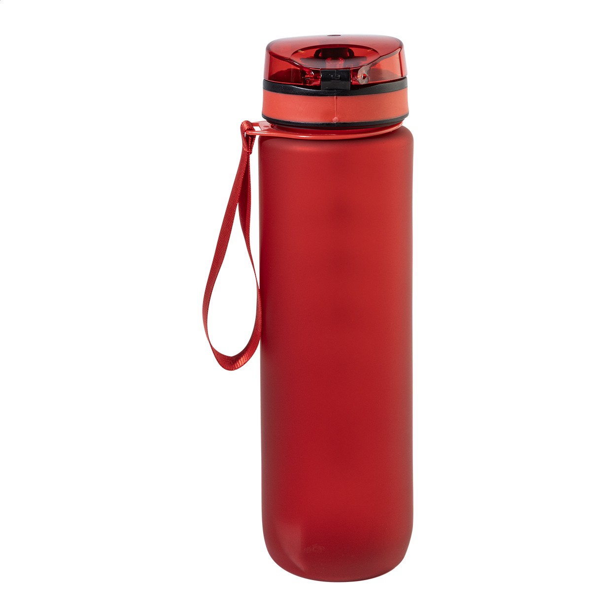 Sticlă sport, din RPET, mată, cu marcaje motivaționale pentru volum și timp, prevăzută cu capac flip-top cu deschidere automată, blocare de siguranță și curea de transport. 1000 ml. Fără BPA. Nu este potrivită pentru băuturi carbogazoase.