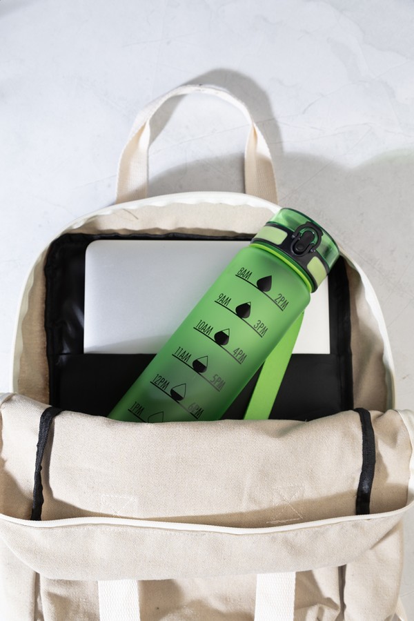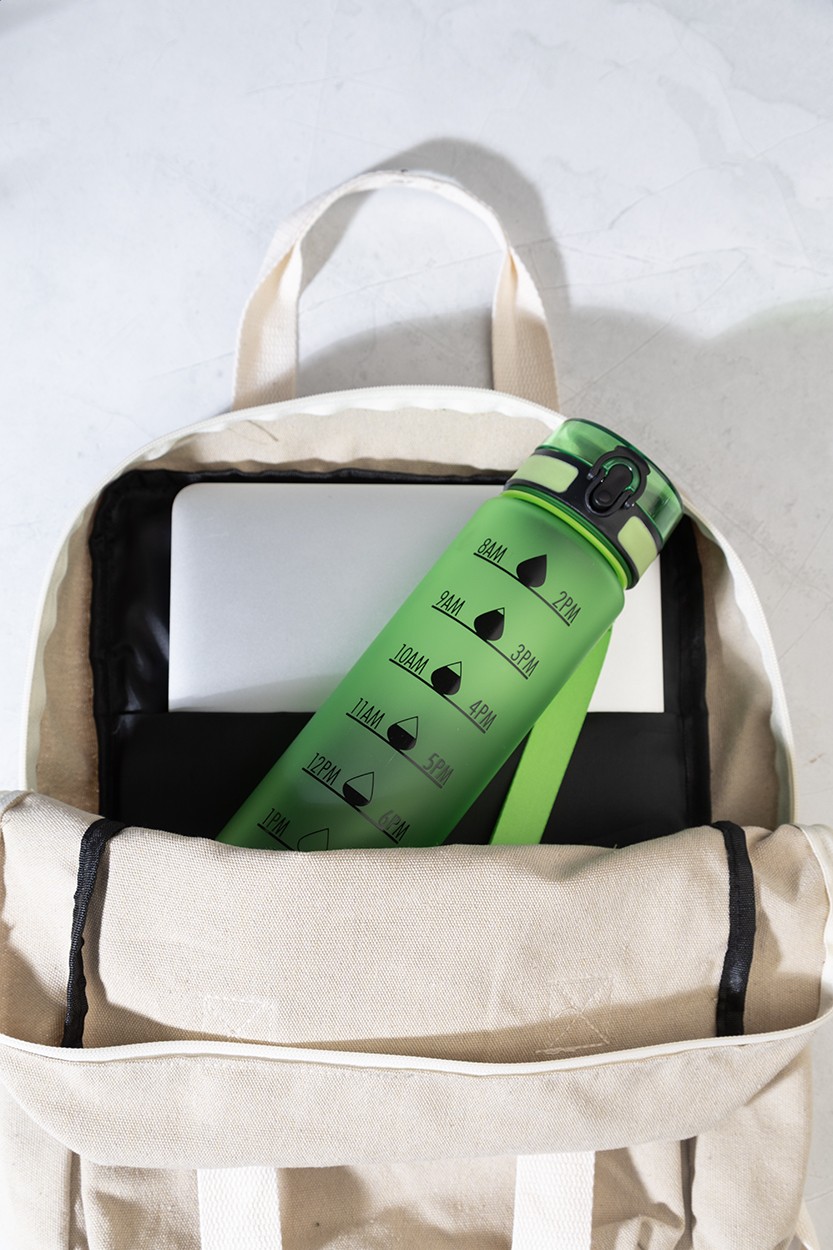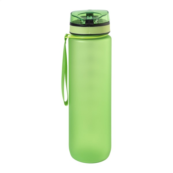 Sticlă sport, din RPET, mată, cu marcaje motivaționale pentru volum și timp, prevăzută cu capac flip-top cu deschidere automată, blocare de siguranță și curea de transport. 1000 ml. Fără BPA. Nu este potrivită pentru băuturi carbogazoase.