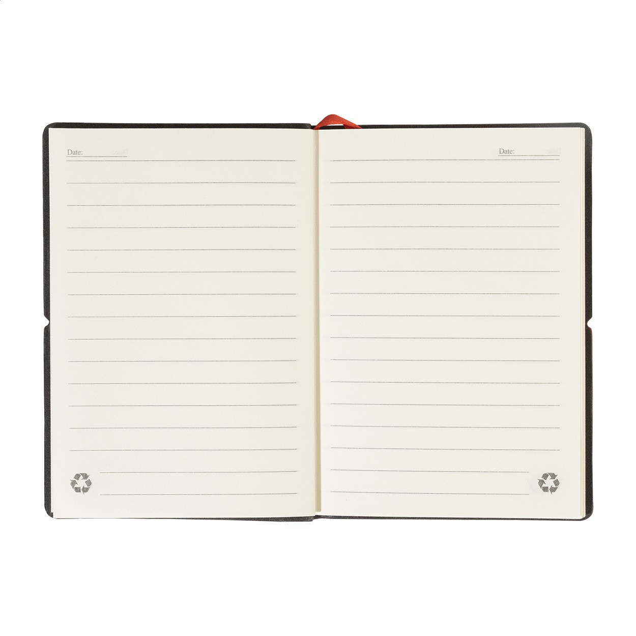 Caiet cu copertă din piele PU reciclată, cu 70 de file dictando, din hârtie reciclată, 25 de bilețele adezive și 125 de marcaje de pagină (în 5 culori diferite). Cu semn de carte și curea orizontală din cauciuc. Dimensiune A6.