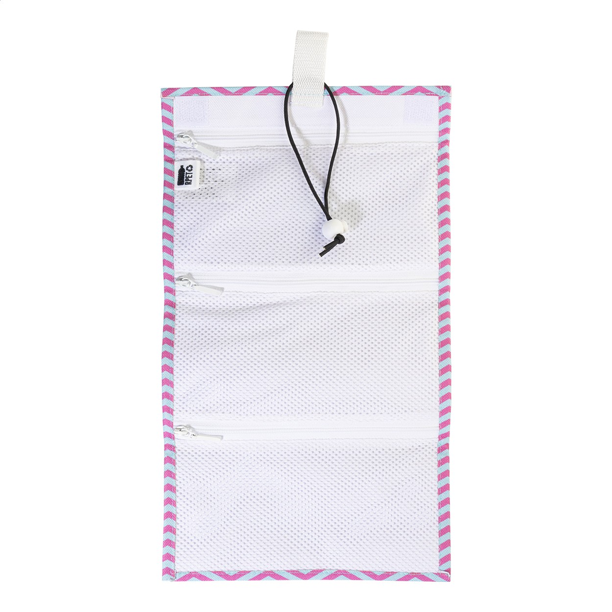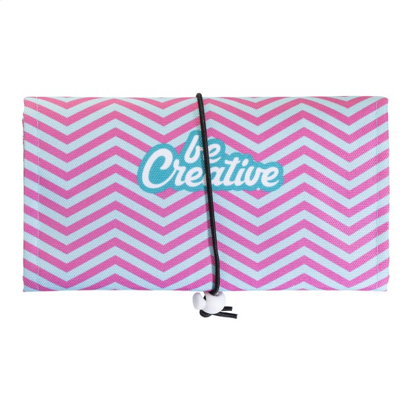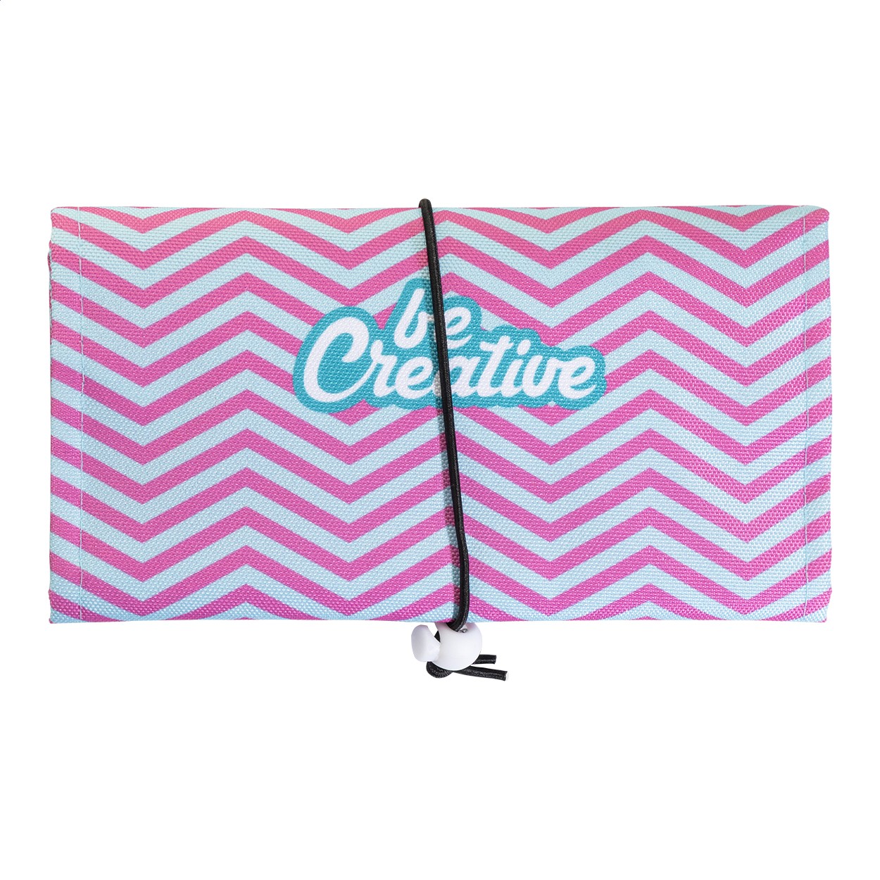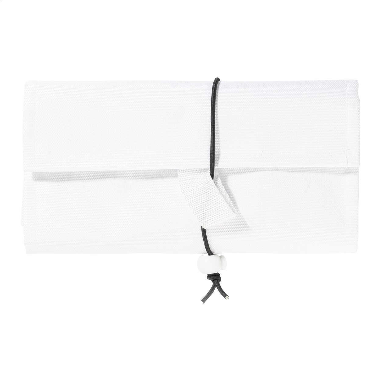 Husă personalizată pentru cabluri, din RPET, cu 3 compartimente din plasă cu fermoar și curea elastică de închidere. Cu grafică imprimată prin sublimare pe toată suprafața. Poliester RPET 600D cu etichetă RPET distinctivă. Cantitate minimă de comandă: 25 bucăți.