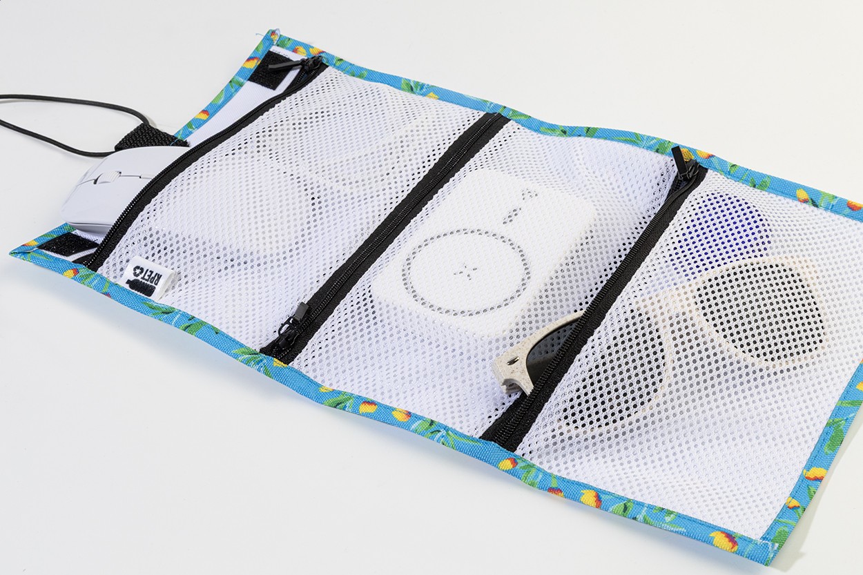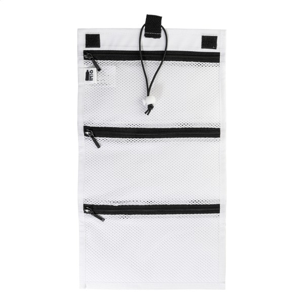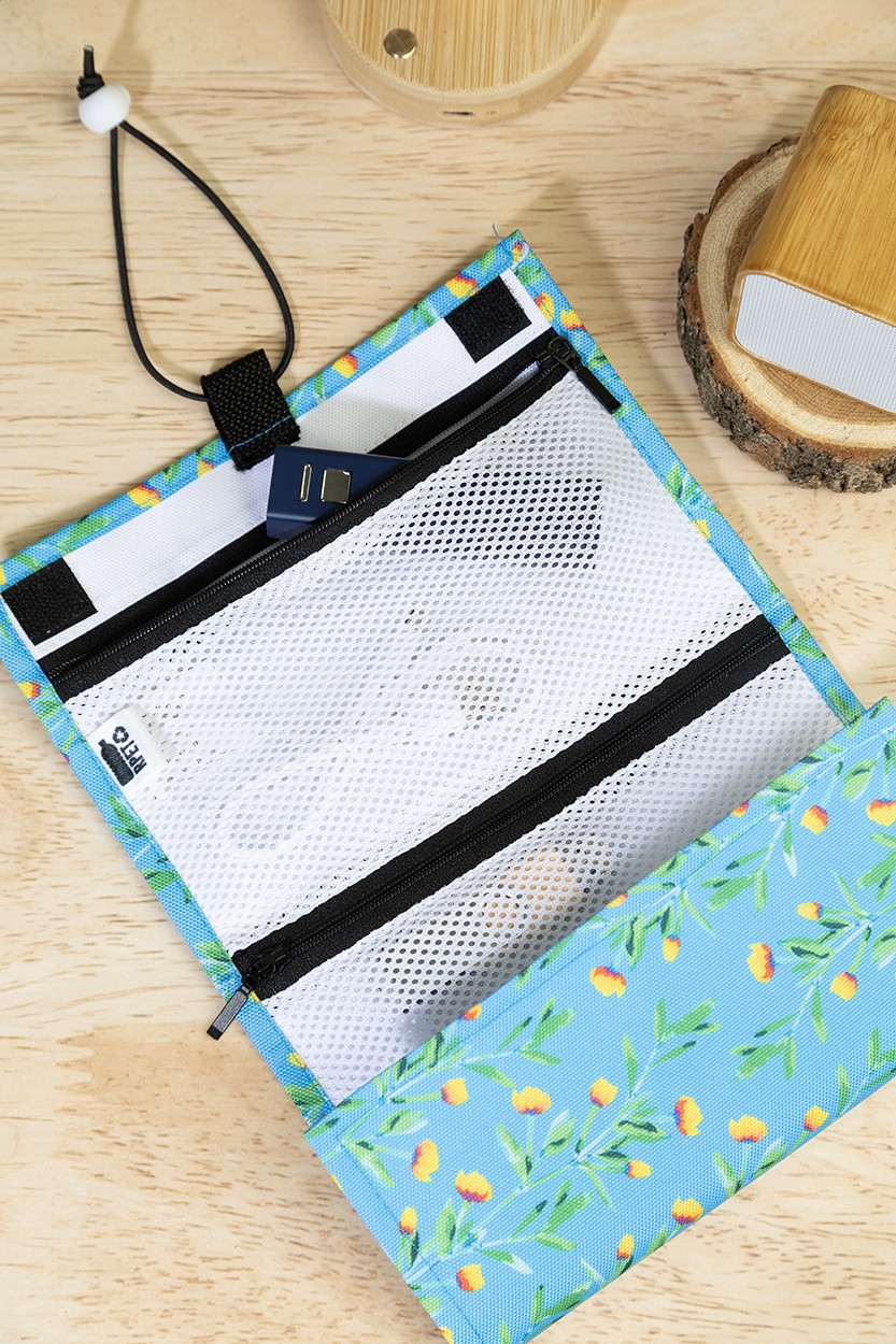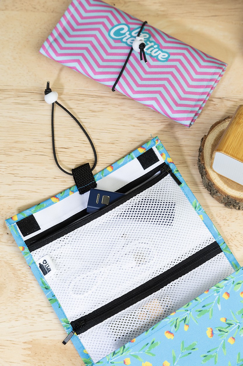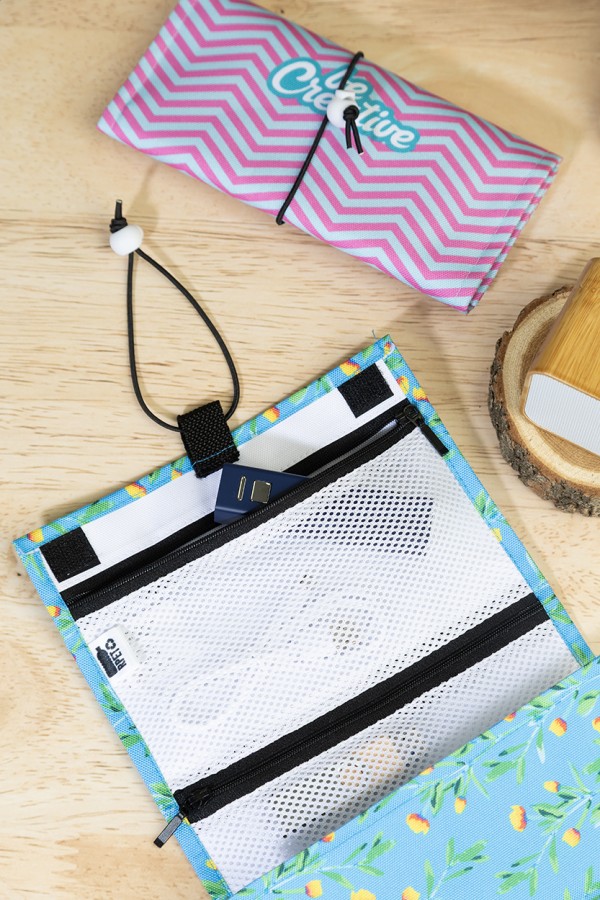 Husă personalizată pentru cabluri, din RPET, cu 3 compartimente din plasă cu fermoar și curea elastică de închidere. Cu grafică imprimată prin sublimare pe toată suprafața. Poliester RPET 600D cu etichetă RPET distinctivă. Cantitate minimă de comandă: 25 bucăți.