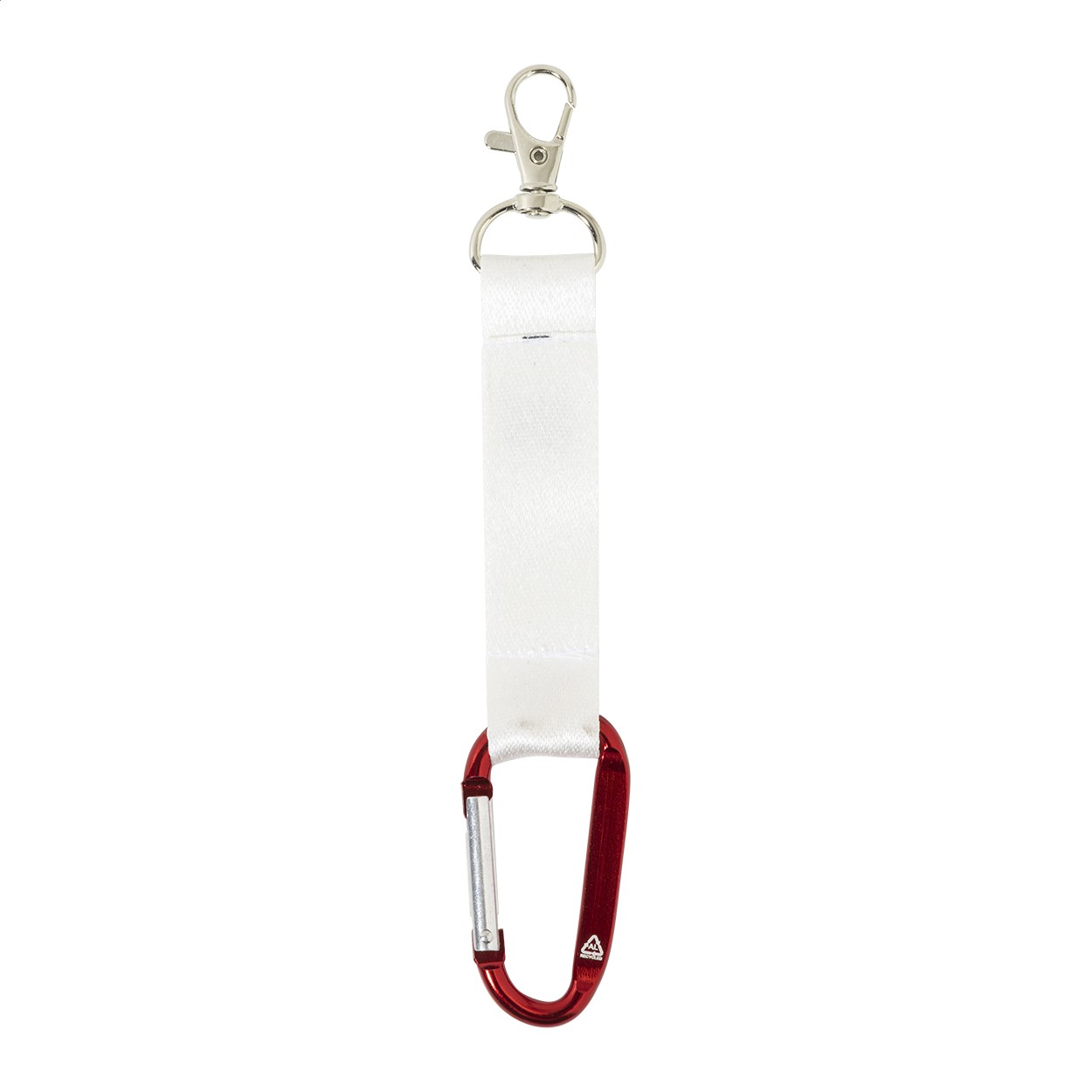 Mini breloc personalizat, din poliester RPET, cu grafică imprimată prin sublimare pe ambele părți. Cu carabine mici din metal și mari din aluminiu reciclat. Cantitate minimă de comandă: 100 bucăți.