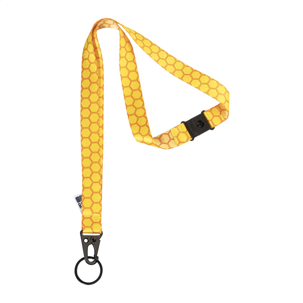 Lanyard RPET personalizat, cu carabină metalică neagră , breloc și cataramă de siguranță. Cu grafică imprimată prin sublimare pe ambele părți. Cantitate minimă de comandă: 100 bucăți.