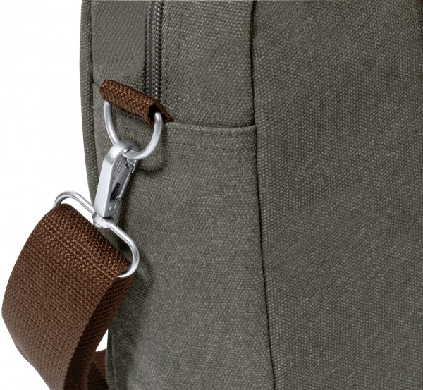 Geantă din pânză, pentru documente, cu compartiment principal cu fermoar și buzunar frontal. Cu compartiment capitonat pentru laptop (15") și tabletă (10"), curea de umăr reglabilă, detalii și mânere din piele PU.