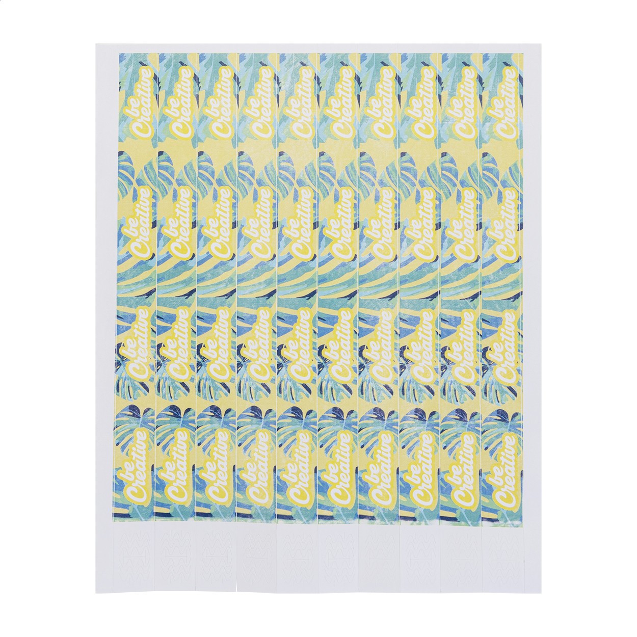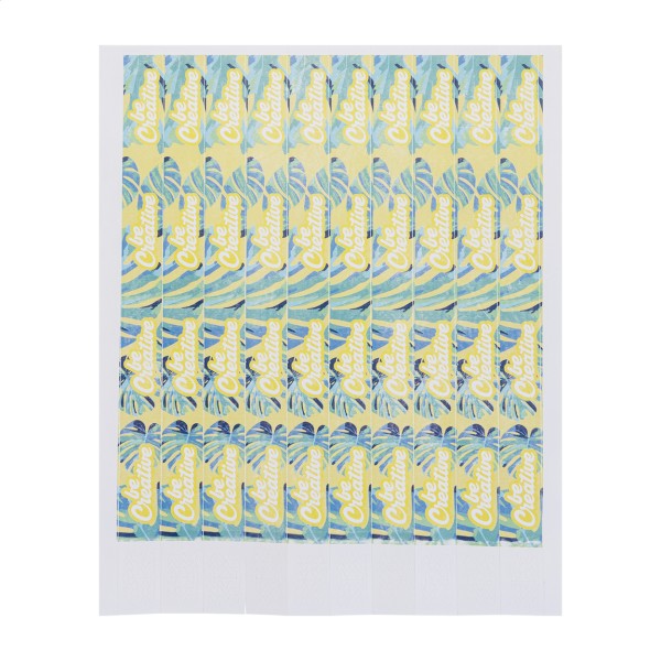 O foaie de brățări Tyvek, imprimate color, cu lățimea de 19 mm (10 bucăți), cu închidere adezivă de siguranță și numerotare unică. Prețul include imprimarea digitală pe partea din față. Cantitate minimă de comandă: 50 bucăți (500 brățări).