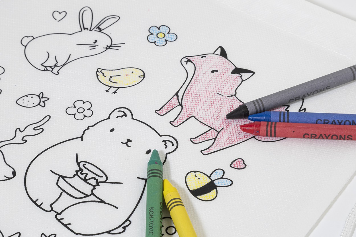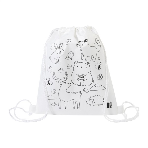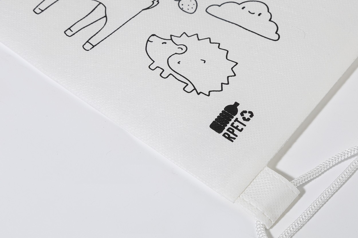 Rucsac cu șnur, de colorat, pentru copii, din material nețesut RPET, cu 5 creioane colorate.